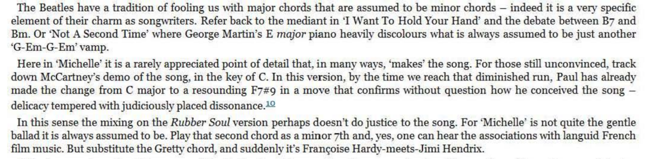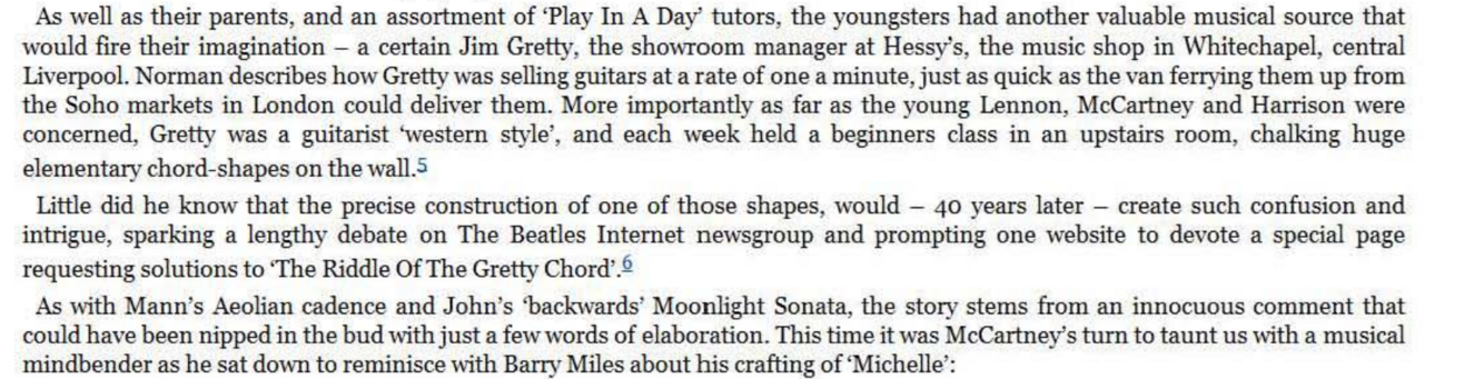 ‘There’s a very jazzy chord in it - “Michelle ma belle”. That second chord. That was a chord we used twice in The Beatles: once to end George’s solo in “T ill There Was You” and again when I used it in this. It was a chord shown to us by Jim Gretty who worked behind the counter at Frank Hessey’s where we used to buy our instruments on the “never never” in Liverpool. So Jim Gretty showed us this one great ham-fisted jazz chord, bloody hell! George and I learned it off him .. .’