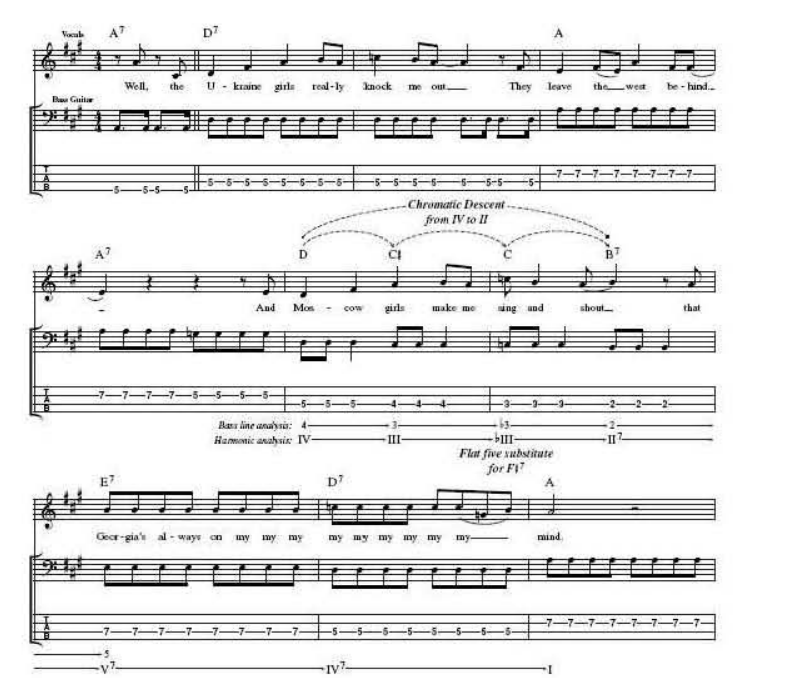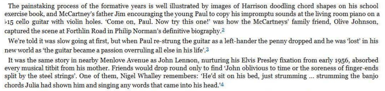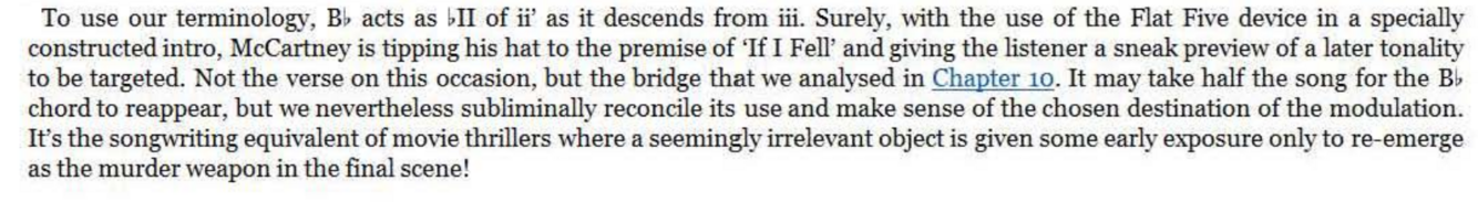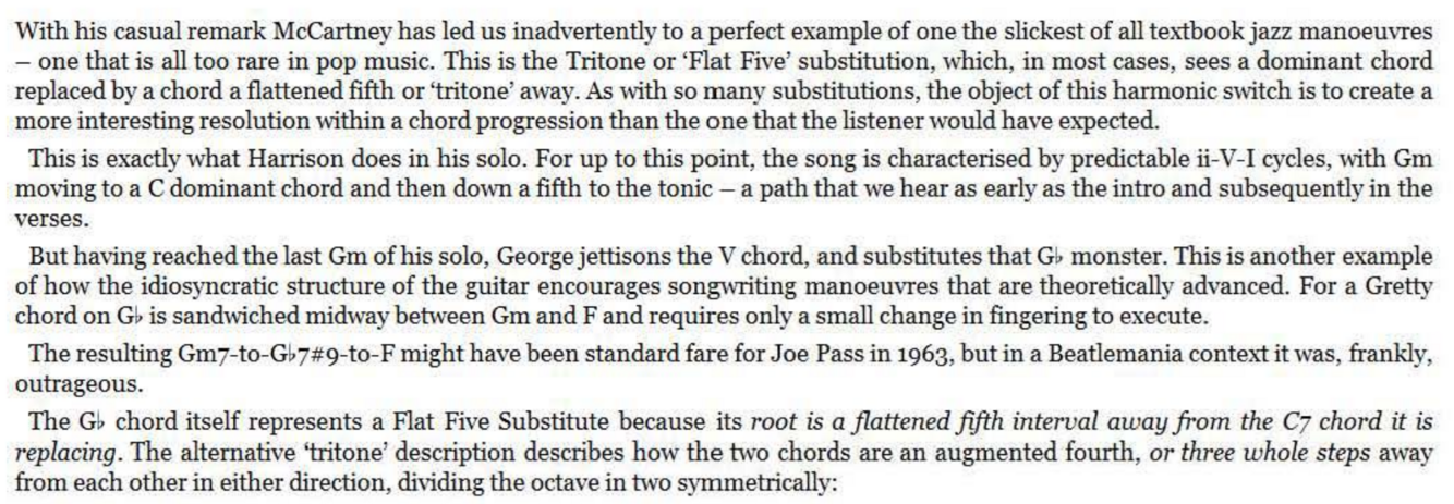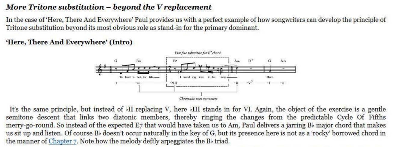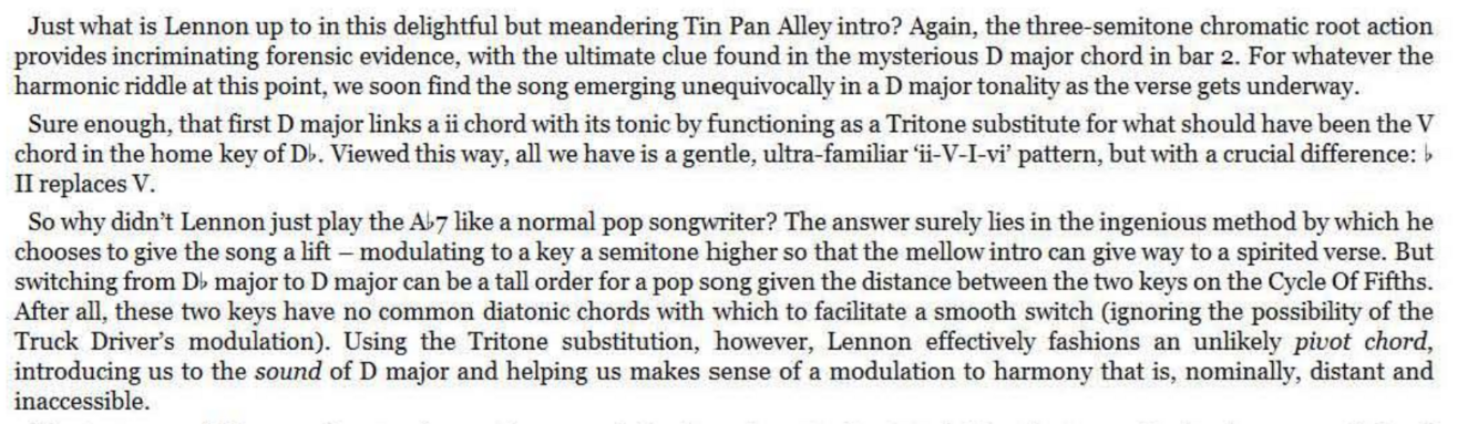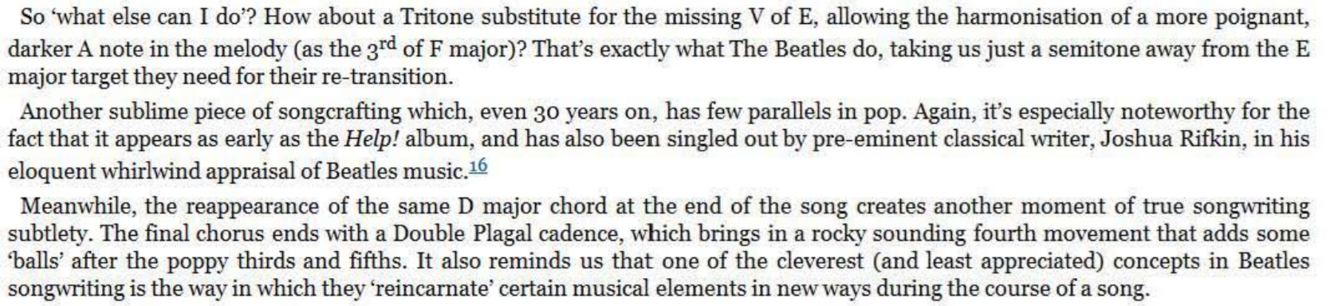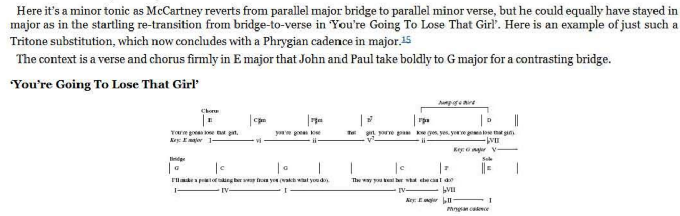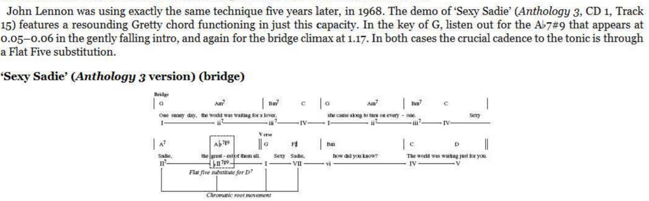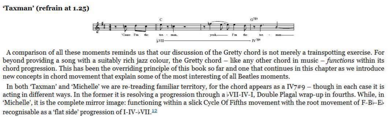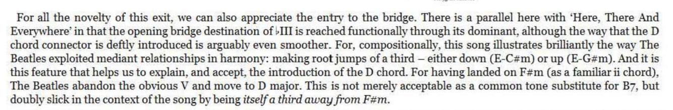 The D chord now not only brings a rocky bVII tinge to the key of E but expertly represents the required V chord of the G major bridge. Having done the hard work with this super -cool transition, the actual bridge harmony itself need be no great shakes , emerging as a simple I- IV -I- IV alternation (as ‘Penny Lane’ would do later). However, unlike ‘Penny Lane’ and many others, the return to the original key for the next verse is not through the obvious route of a V7 ‘connector’. It could so easily have been, of course, with that final C chord begging to be slid down to B for the simplest of bVI-V-I returns to E major. Try it, perhaps with a melody line that follows the roots of C and B - it works.