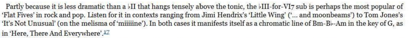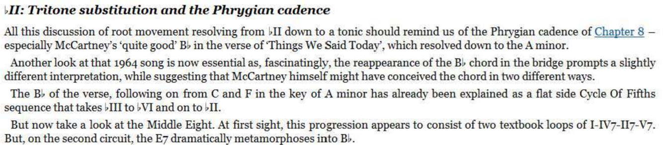 three - semitone voice- leading and it only partially thwarts the expected Cycle Of Fifths movement - unlike the II-bII -i of the bridge which drives a straight line through the cycle, with a root movement that returns to base ‘as the crow flies’. The ultimate resolution in both cases is a Phrygian cadence, as bII moves to the tonic. And yet bVI-bII-i can also be construed as a tritone sub for a V7 only now in the context of a ~ bVI - V7 -i resolution.