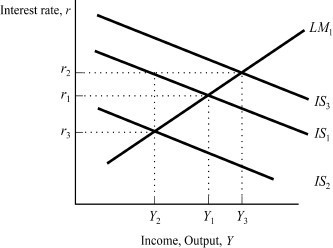 Based on the graph, starting from equilibrium at interest rate r1 and income Y1 a tax cut would generate the new equilibrium combination of interest rate and income: