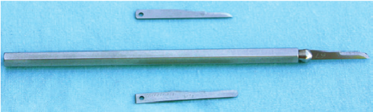 Beaver surgical knife handle with a #64 (bottom) and #67 (top) blade