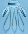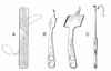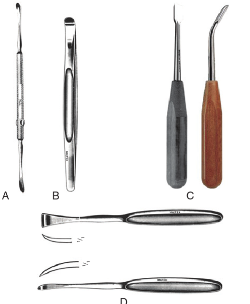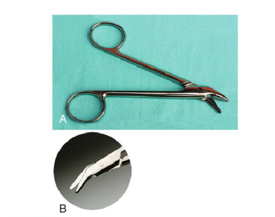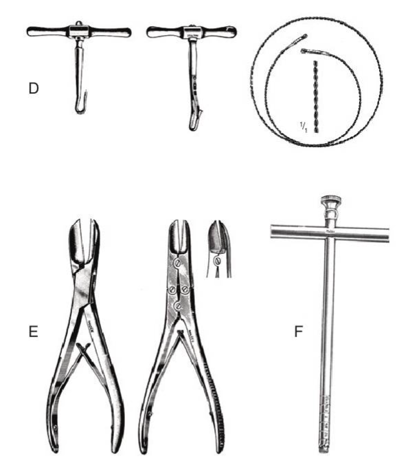 E: Bone cutting forceps (note paired, chisel-tips)