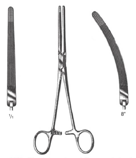 Rochester-Carmalt, has longitudinally-oriented serrations intended for jaw-clamping (pedicle grasping)