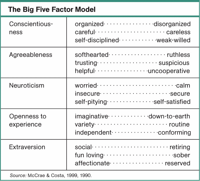 the traits of the five fator model: conscientiousness, agreeableness, neuroticism, openness to experience, and extraversion