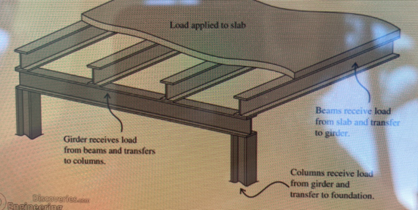 Steel, concrete, or timber columns (posts) supporting a grid of beams on which the flooring is applied