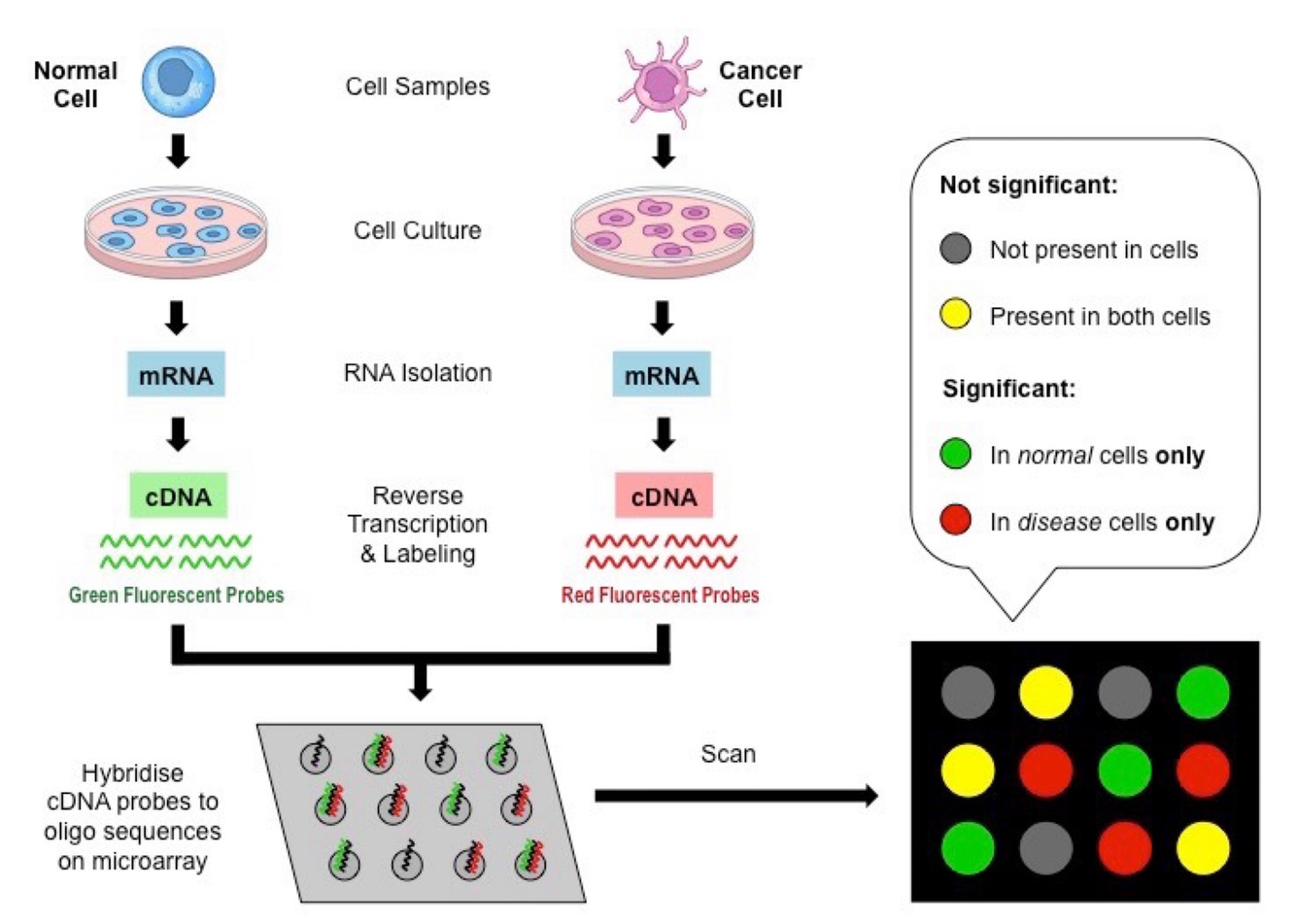 This is done by using cDNA to make a reverse DNA strand from RNA and dying each strand from each type of cell a certain color. The dyes go into a palette and depending on the gene strand on each spot (probe), certain complementary dyes will stick to certain spots. That way you can tell instantly what gene is expressed more in each type of cell.