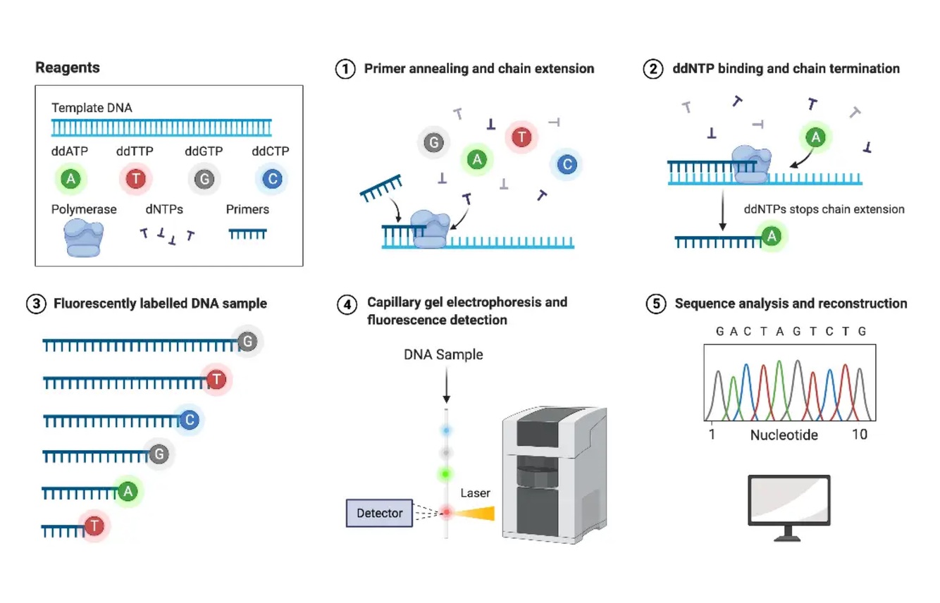 It uses PCR to copy DNA, and adds a dyed dideoxynucleotide (its missing the 3’ OH so nothing can bind after it) to stop transcription. The new DNA strands are arranged into shortest to longest and a computer is used this to figure out the sequence of the template DNA