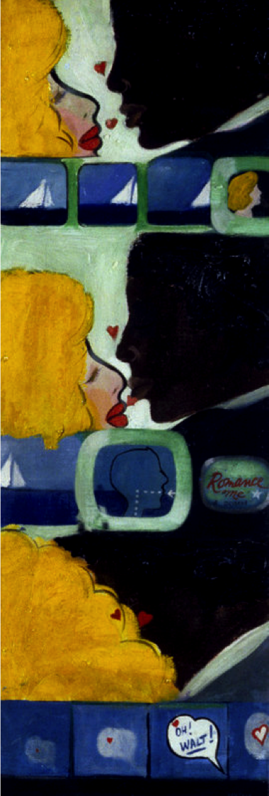 JOYCE WIELAND, FIRST INTEGRATED FILM WITH A SHORT ON SAILING, 1963, OIL ON CANVAS, 66 X 22.7 CM.