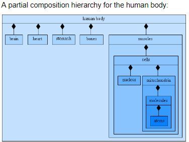 Into constiuent parts, defining one class as the whole and the other classes as part of the whole.