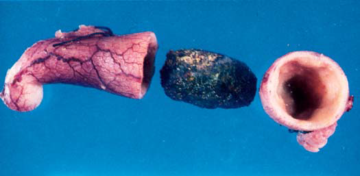 Obstruction of its orifice, secondary distention of the lumen and bacterial invasion of its wall. Intraluminal pressure exceeds venous pressure - venous stasis with ischemia, mucosal ulceration, invasion. Microabscesses with neutrophils.