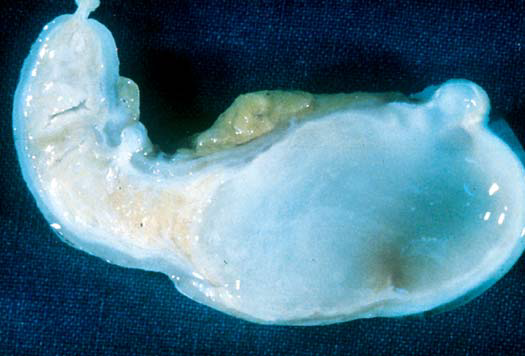 Mucocele. Caused by a mucinous cystadenoma or mucinous cystadenocarcinoma.