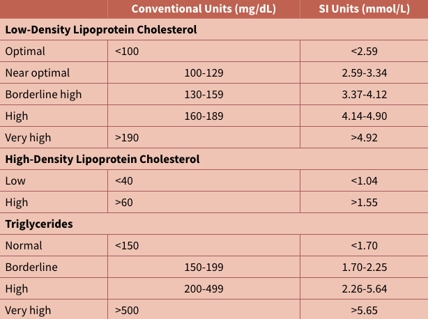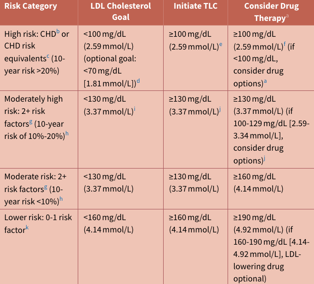 Adult treatment panel 3 guidelines on levels of LDL, HDL, TG