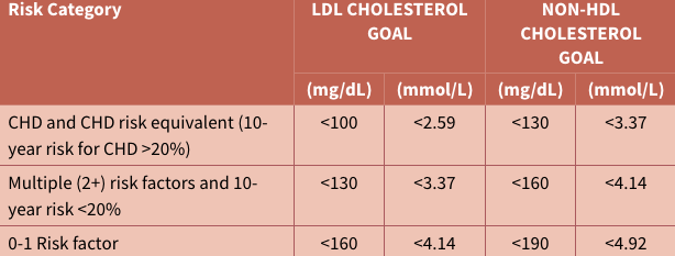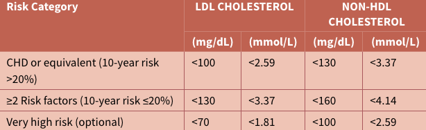 ACC/AHA guidelines on targets for LDL-C and non-HDL-C at different risks