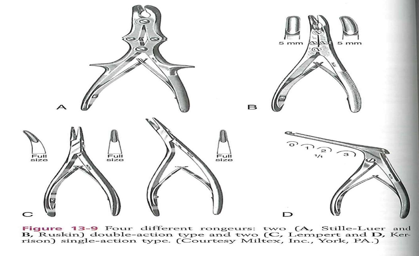 Stille-Luer, Ruskin, Lempert (finer more delicate jaws), Kerrison (has a cutting blade)