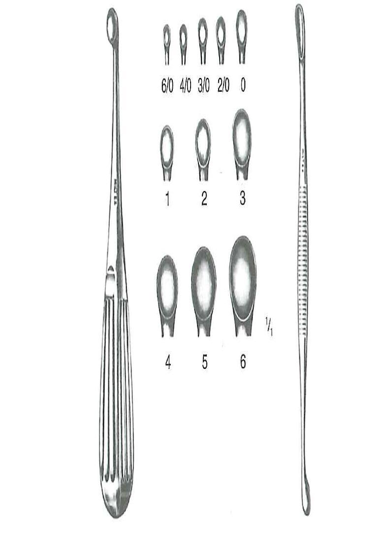 Currettes – used to remove bone or soft tissue particularly from restricted sites (cancellous bone harvesting, bulla osteotomy).