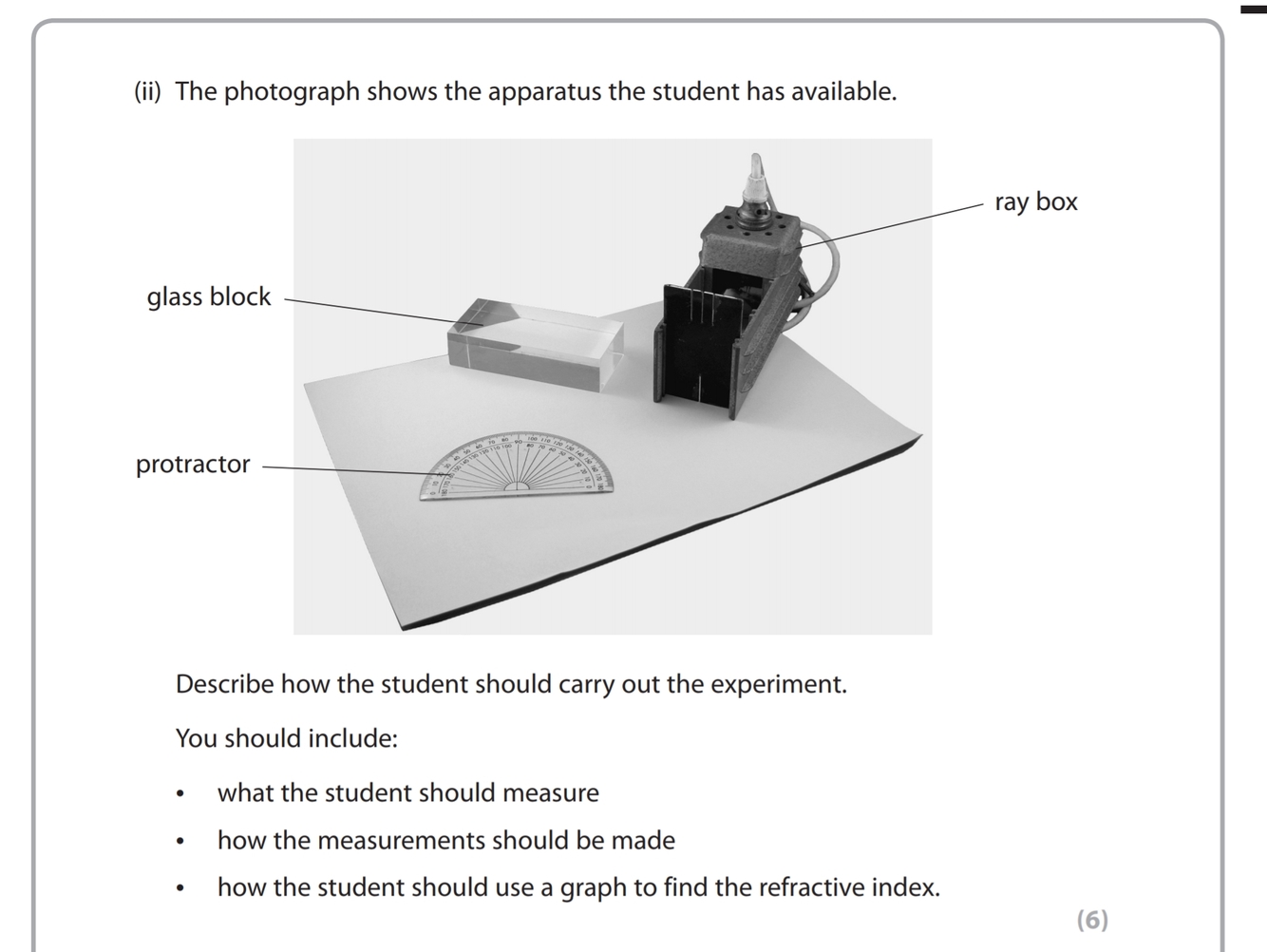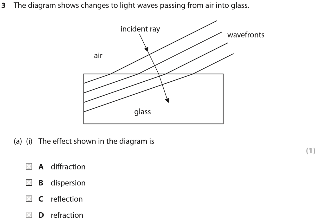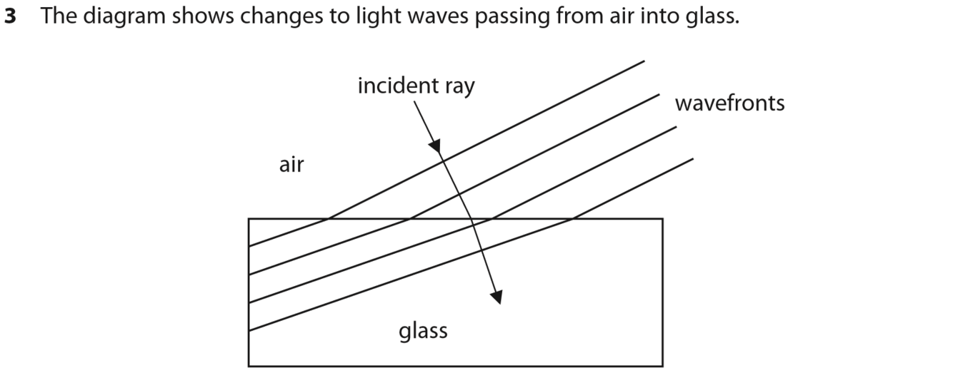State two ways in which light waves change as they pass into the glass (2)