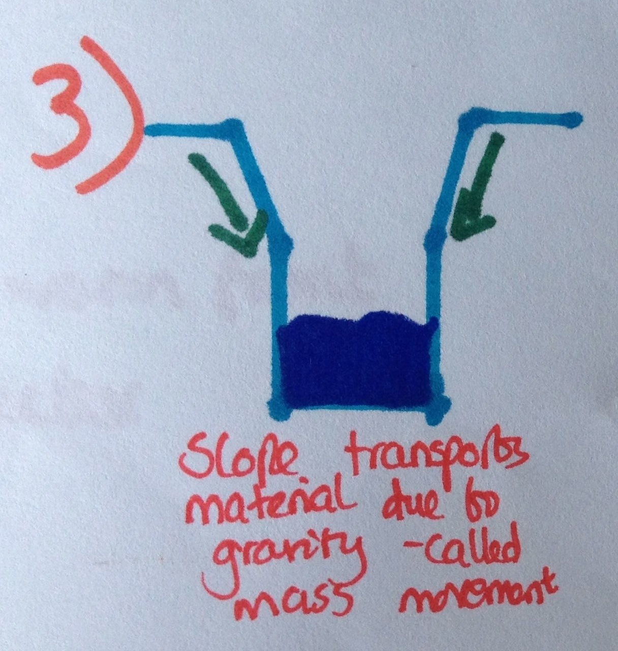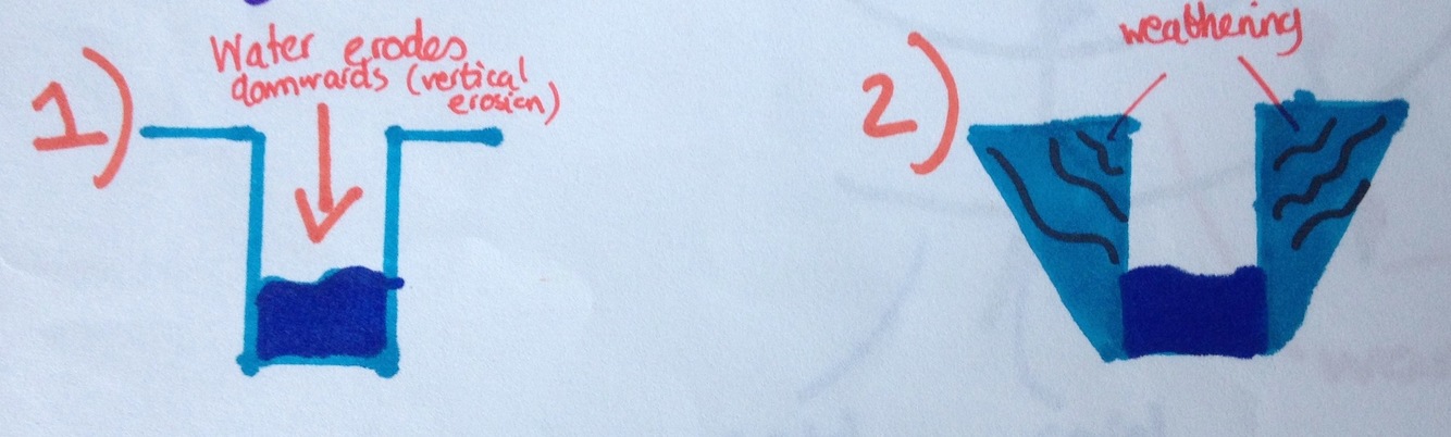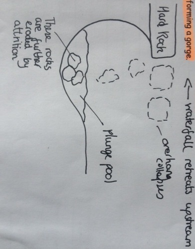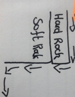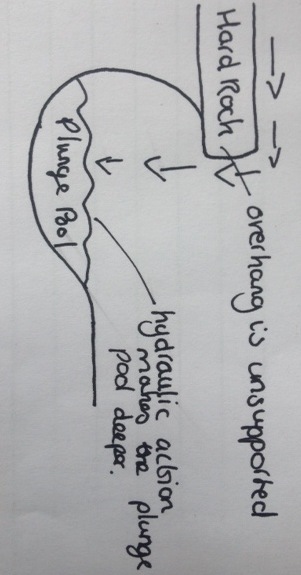 hard and soft rock, eroding the soft rock more quickly by hydraulic action. Overtime the hard rock sticks out over the soft rock to form an overhang.