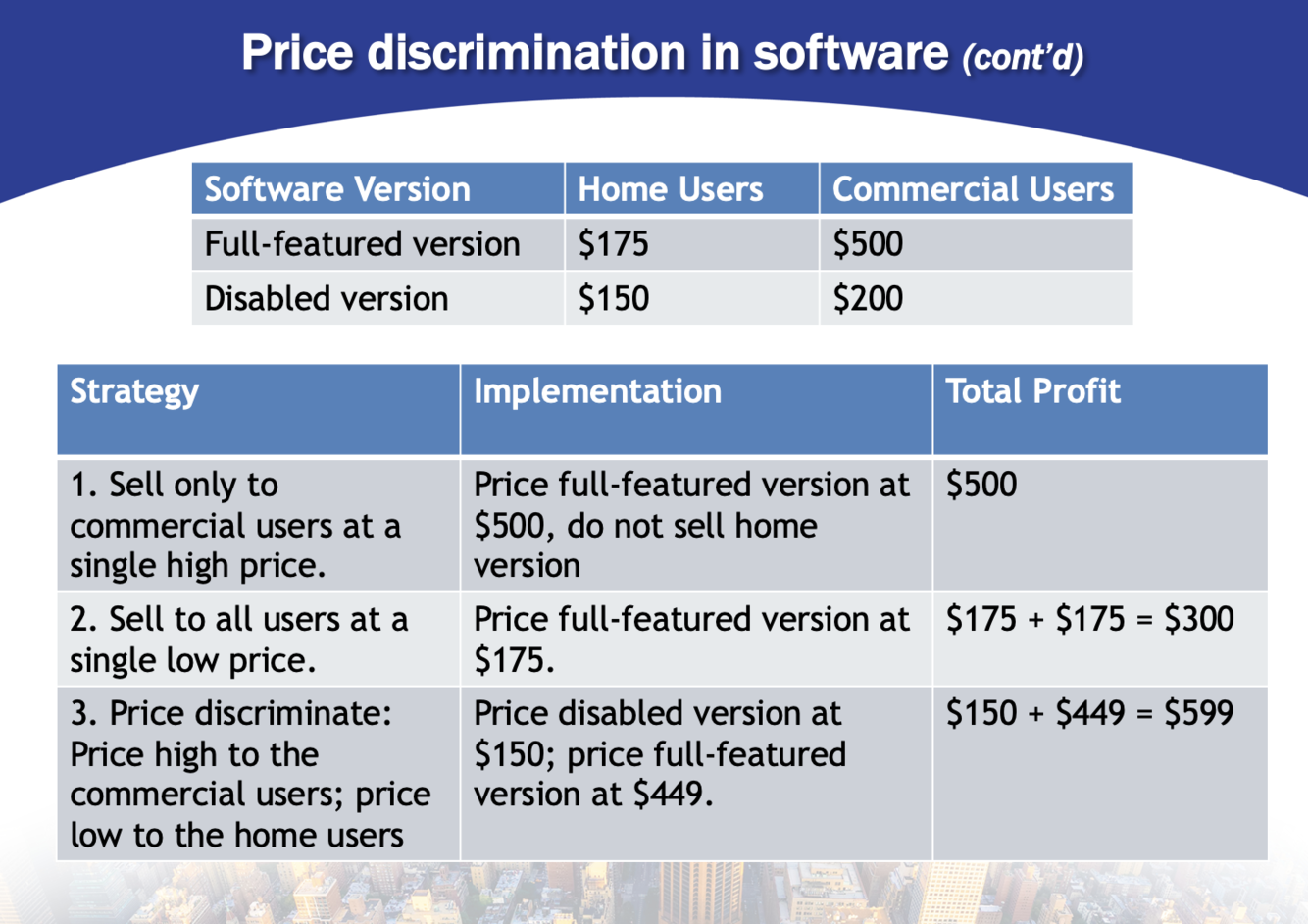 Software manufacturers discriminate between high- and low-value consumers by offering different versions of software designed, and priced, to appeal to different groups