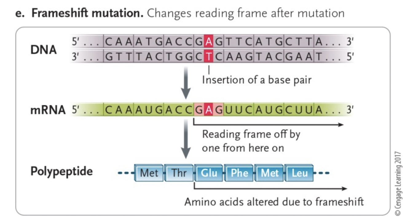 •A single base-pair deletion or insertion in the coding region of a gene alters the reading frame of the resulting mRNA