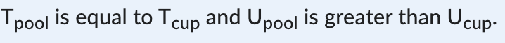 A cup of water is scooped up from a swimming pool of water. Compare the temperature T and the internal energy U of the water in both the cup and the swimming pool.