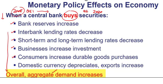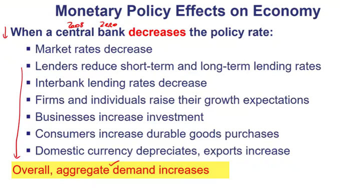 When central bank decreases policy rate, what are the effects of econ and agg demand?