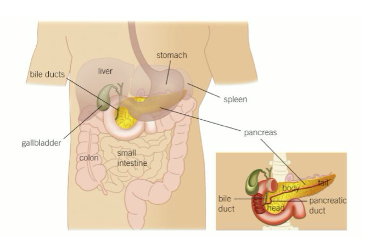 The pancreas is found in the upper abdomen, behind the stomach (Figure 1).