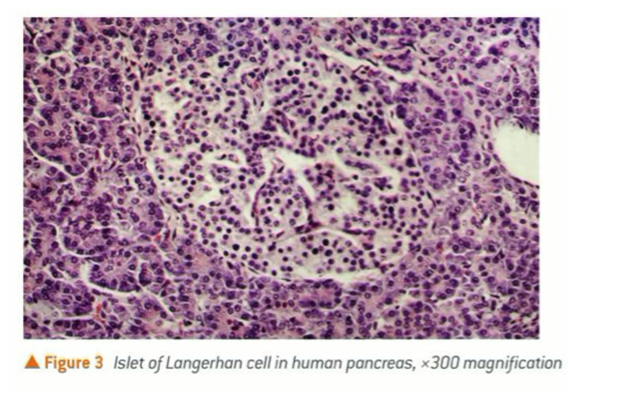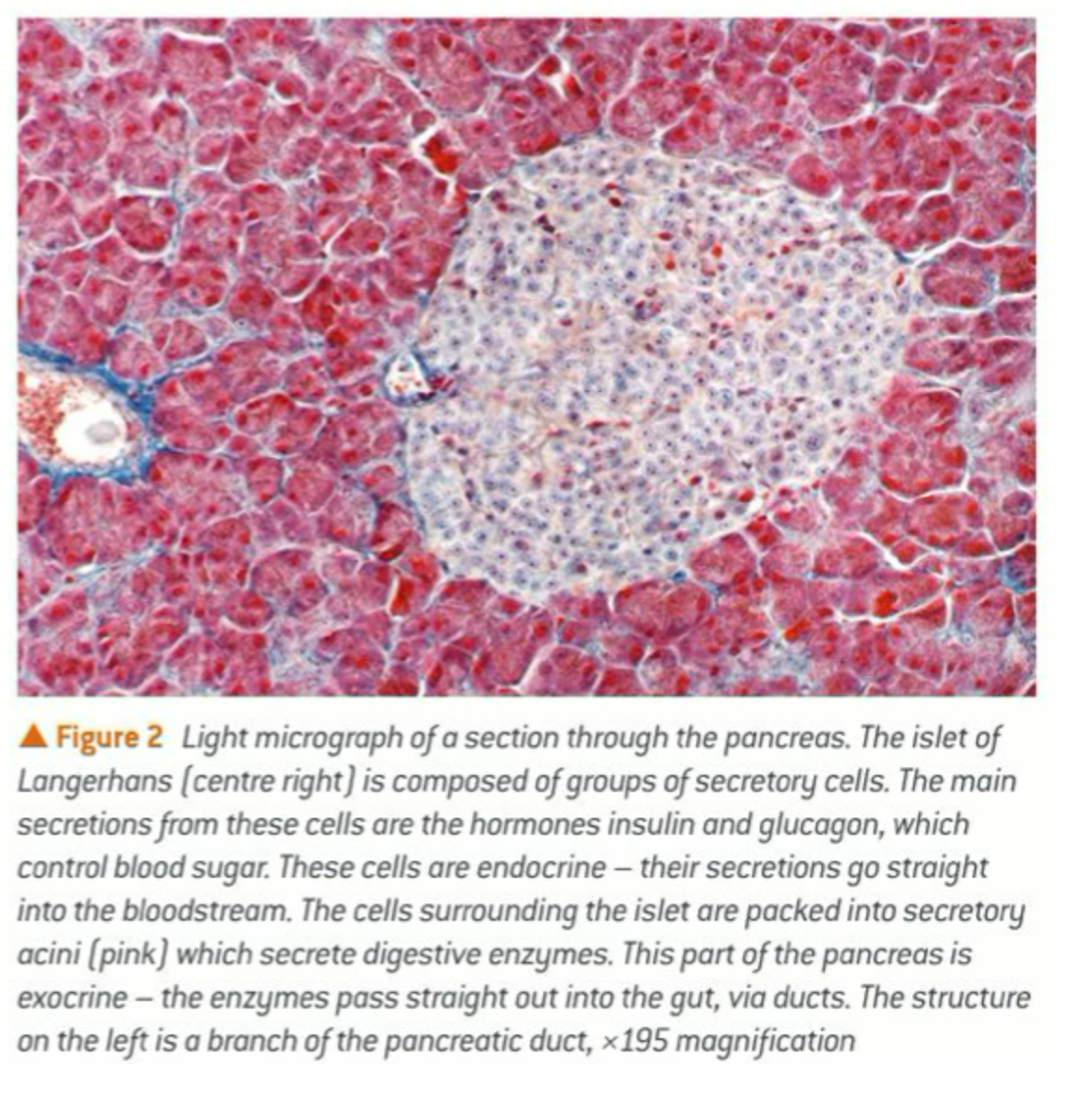 When viewed under a microscope, you can clearly see the differences between endocrine and exocrine pancreatic tissue.