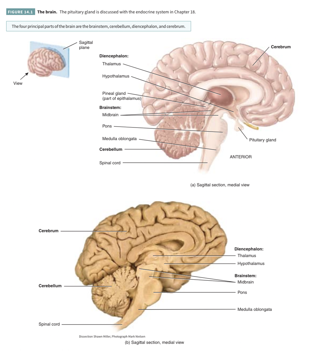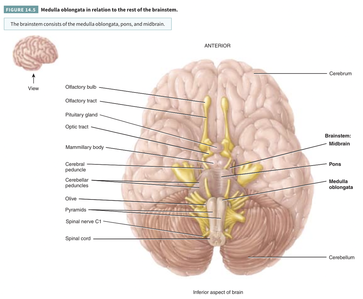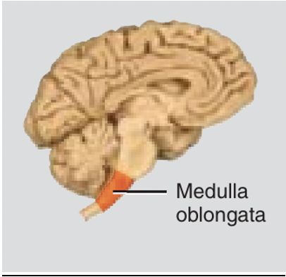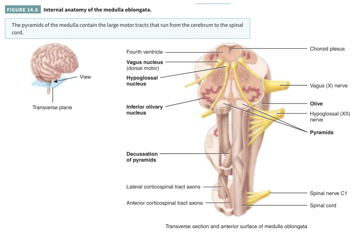 AKA medulla; begins at the foramen magnum and extends to the inferior border of the pons. Contains sensory (ascending) and motor (descending) tracts. Also contain nuclei that coordinate vomiting, swallowing, sneezing, coughing, and hiccupping.