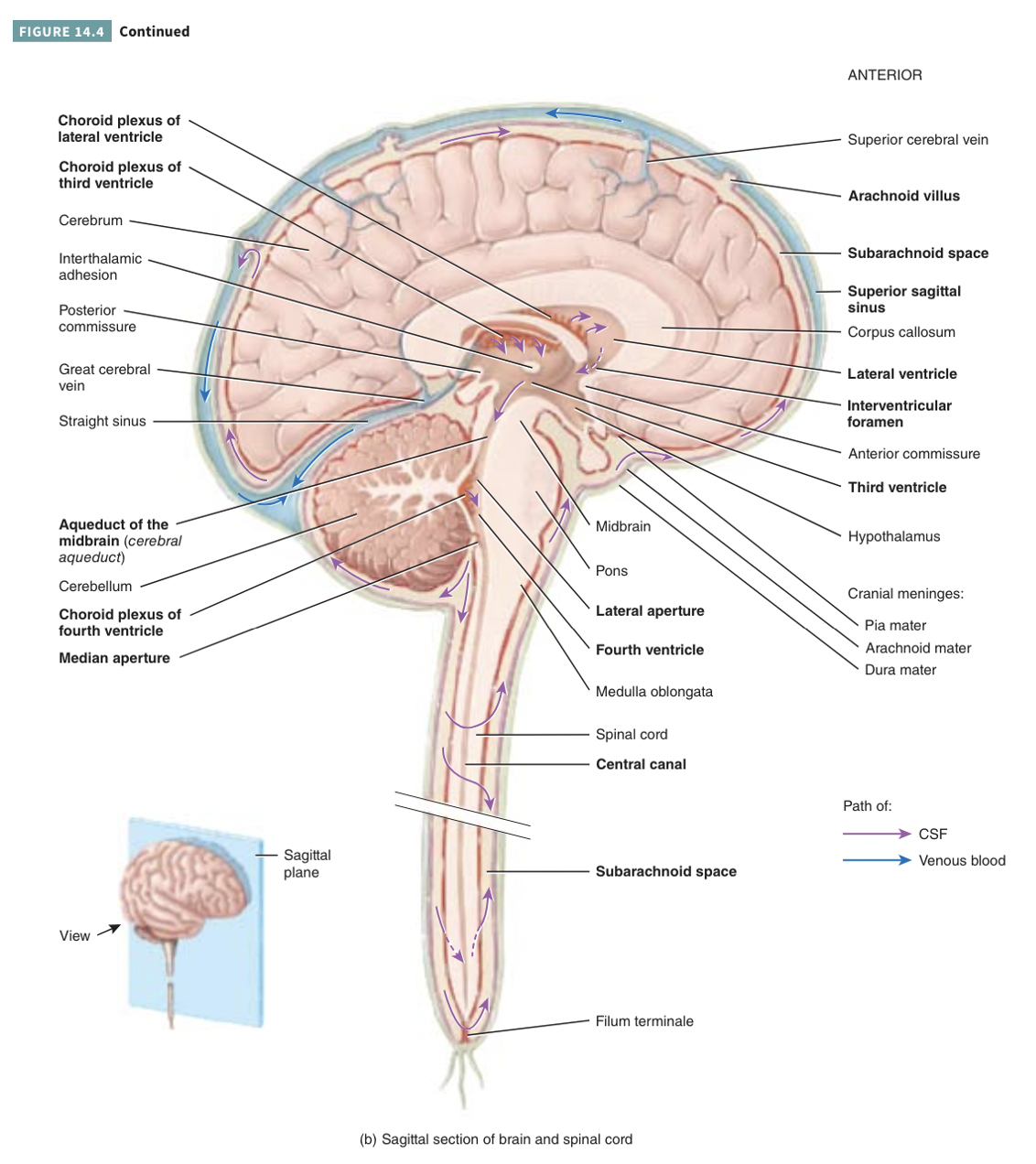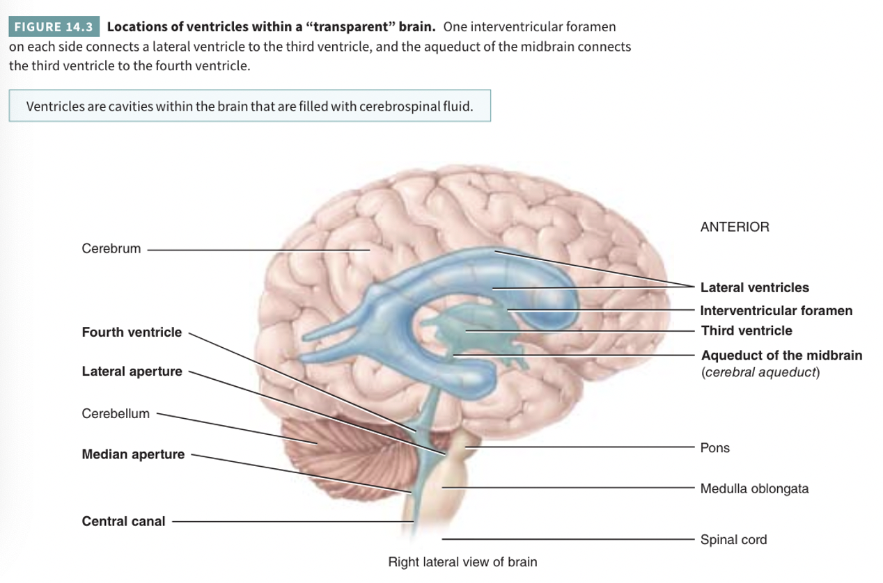 Fourth ventricle: lies between the brainstem and the cerebellum.