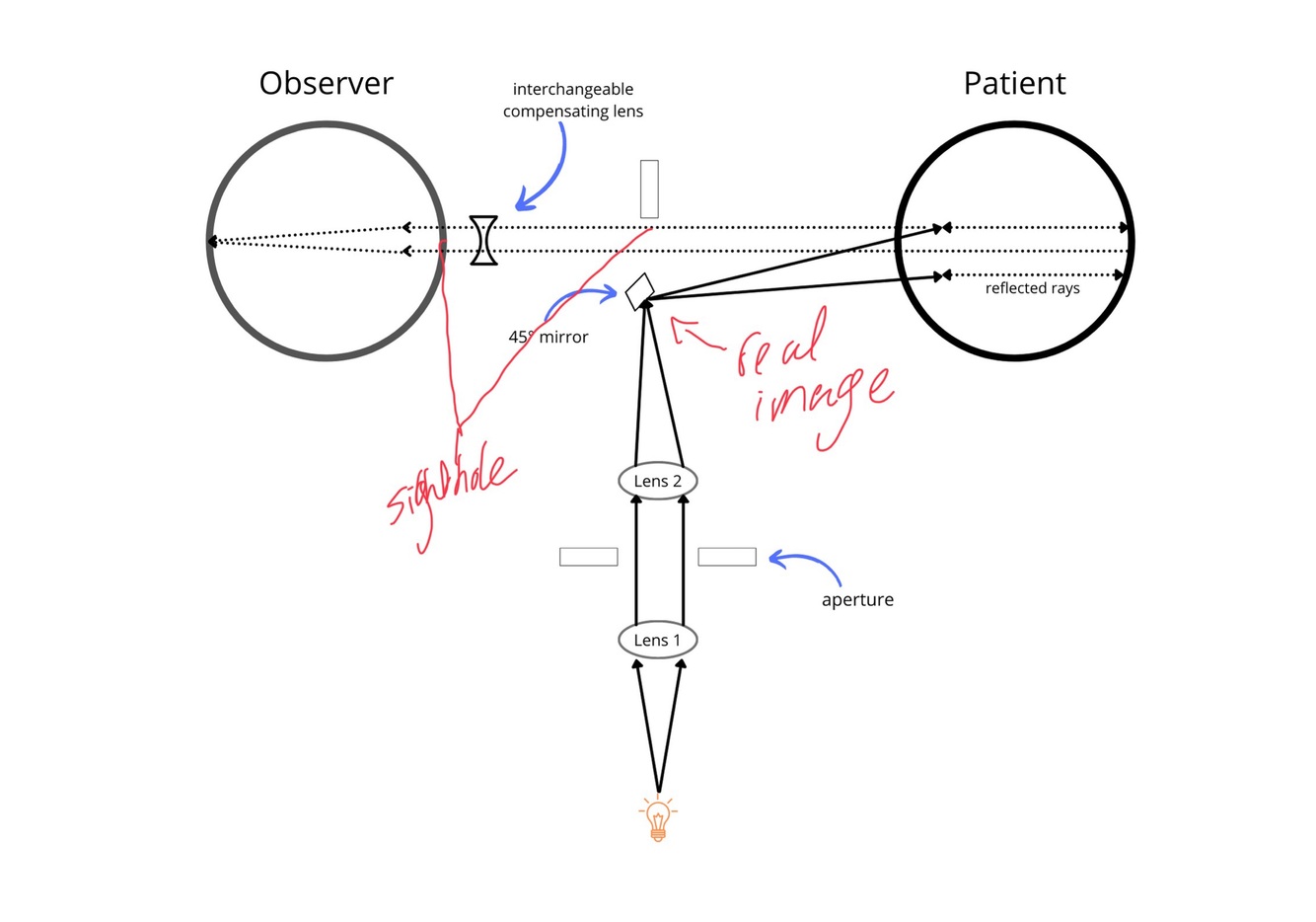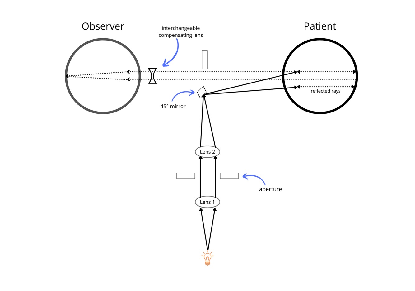 The instrument consists of a system of lenses which focus light from an electric bulb on to a mirror where a real image of the bulb filament is formed. The mirror reflects the emitted light in a diverging beam which is used to illuminate the patient’s eye. The mirror contains a hole through which the observer views the illuminated eye. The image of the bulb is formed just below the hole so that its corneal reflection does not lie in the visual axis of the observer.