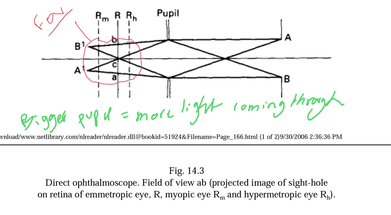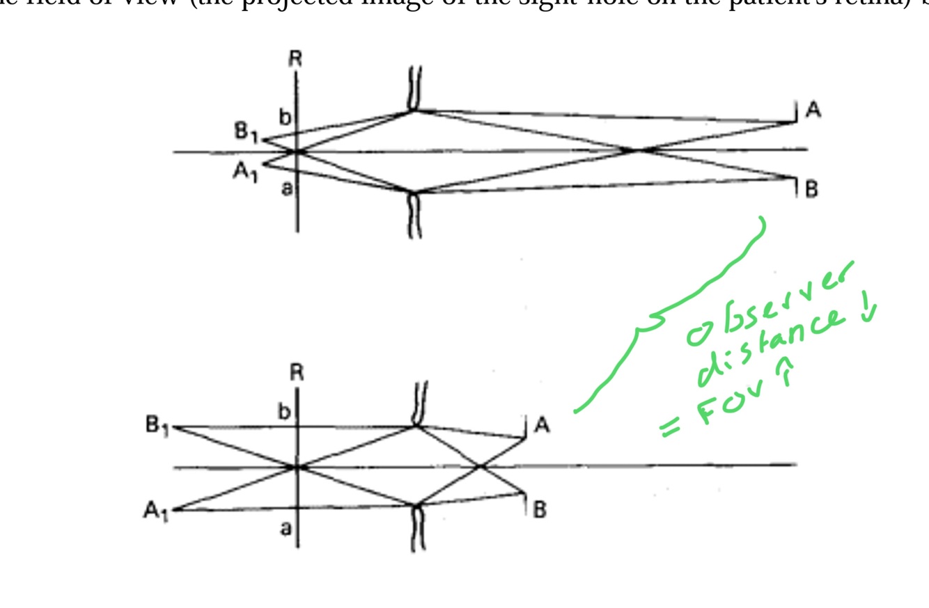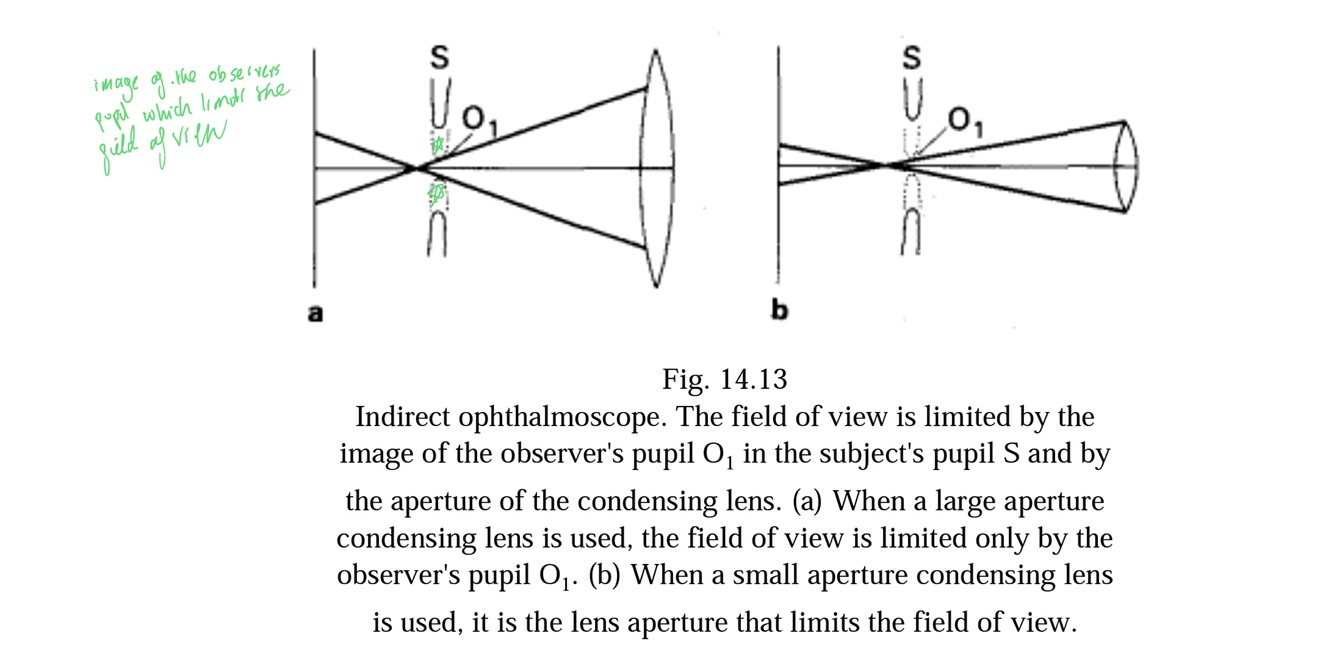 In indirect ophthalmoscopy, how does the refractive state of the patients eye effect the field of view. Picture below is of direct ophthalmoscope for comparison