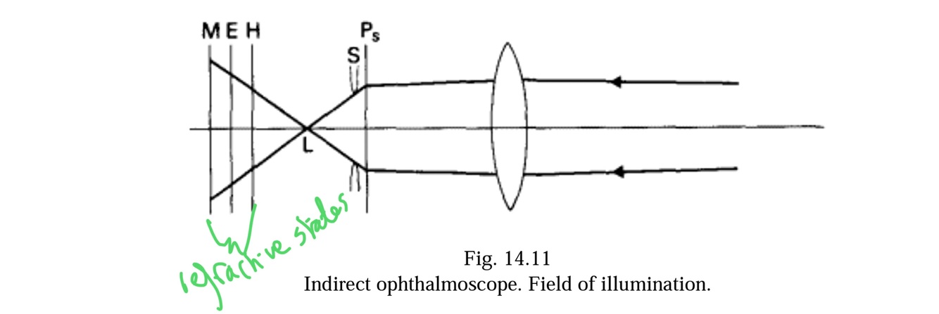 Light from a lamp mounted on a head piece is refracted through a condensing lens (+20D or +30D) into the patients retina. The light is reflected off the patients retina and is then refracted through the same condensing lens. This forms a real inverted image between the observer and the condensing lens.