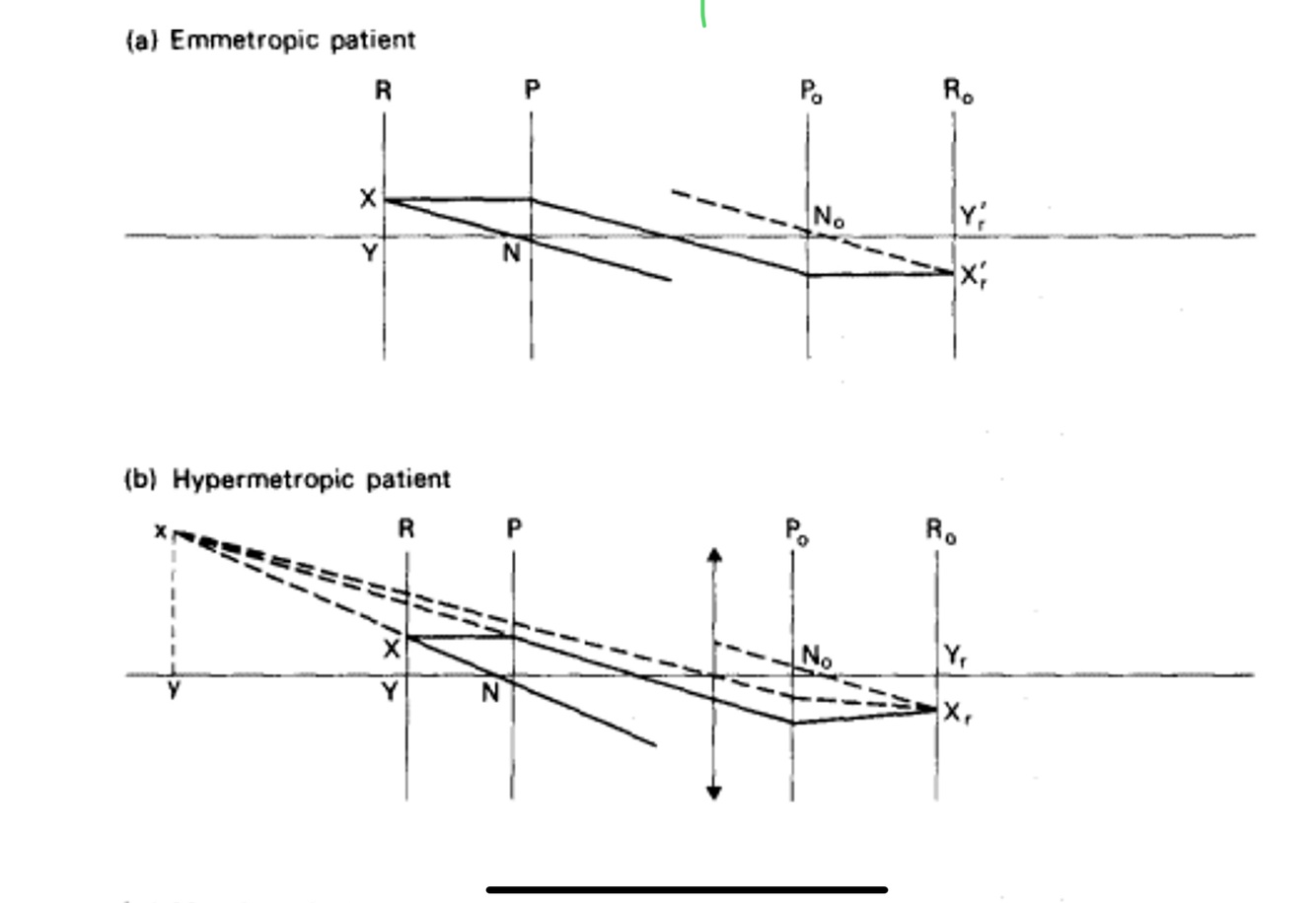 Eg, if patient is myopic, need to add concave lens to the ophthalmoscope so that rays enter observers emmetropic eye parallel and can focus on their retina. If not, it forms a blur circle on the observers retina.