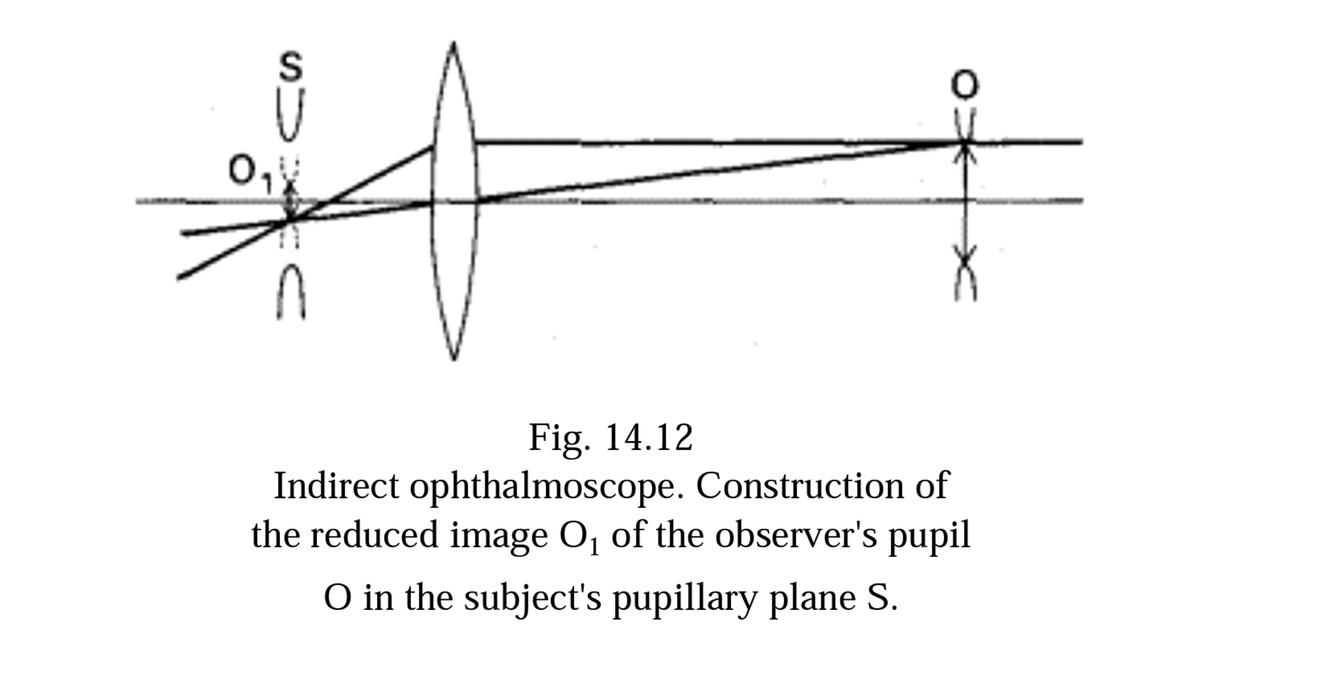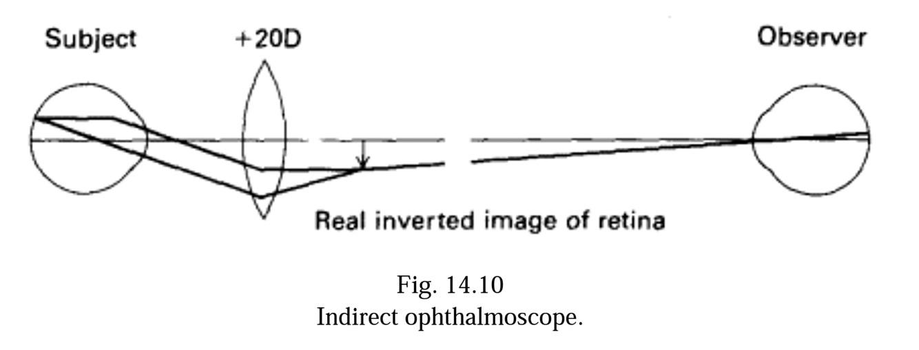 Light from a lamp mounted on a head piece is refracted through a condensing lens (+20D or +30D) into the patients retina. The light is reflected off the patients retina and is then refracted through the same condensing lens. This forms a real inverted image between the observer and the condensing lens.
