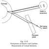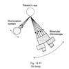 The instrument consists of a system of lenses which focus light from an electric bulb on to a mirror where a real image of the bulb filament is formed. The mirror reflects the emitted light in a diverging beam which is used to illuminate the patient’s eye. The mirror contains a hole through which the observer views the illuminated eye. The image of the bulb is formed just below the hole so that its corneal reflection does not lie in the visual axis of the observer.