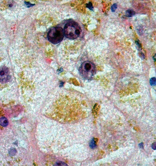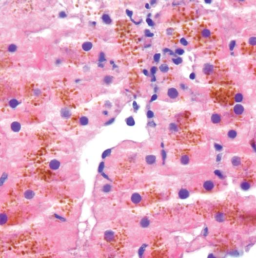 A biopsy of the liver shows a normal appearance except for coarse, iron-free dark-brown granules in hepatocytes and Kupffer cells.