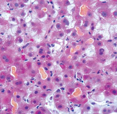 Signaled by elevation of bilirubin, cholesteral, and bile acids, and elevated alkaline phosphatase activity.