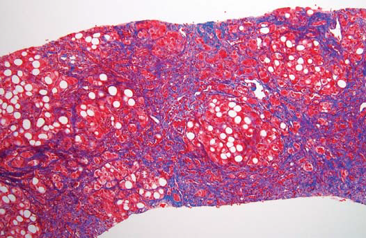 A patient presents with long-standing jaundice, hypoalbuminemia, and low coagulation factors. The following is seen on biopsy.