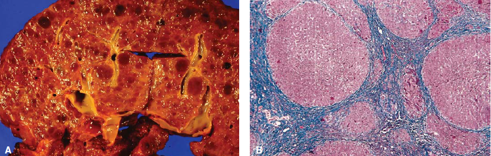 Macronodular cirrhosis. Late in disease, grossly visible coarse, irregular nodules.