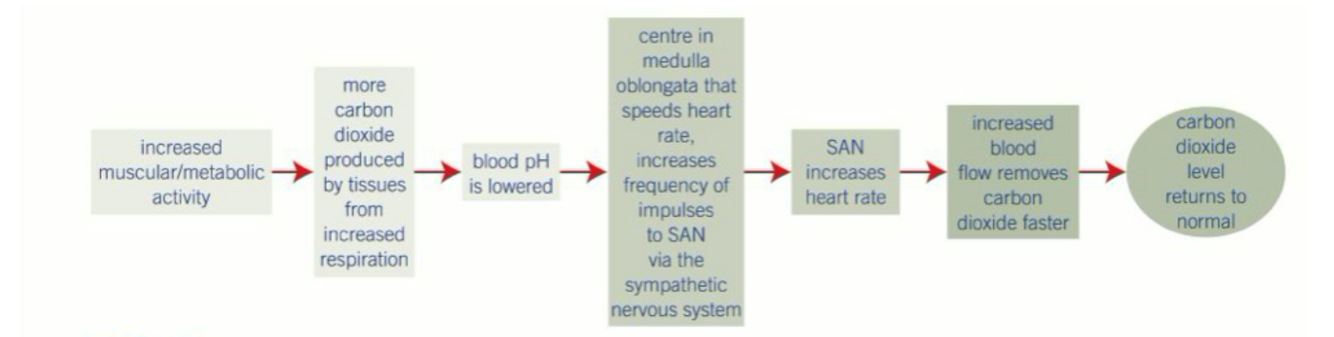 If the chemoreceptors detect a decrease in blood pH, a response is triggered to increase heart rate - blood therefore flows more quickly to the lungs so the carbon dioxide can be exhaled.
