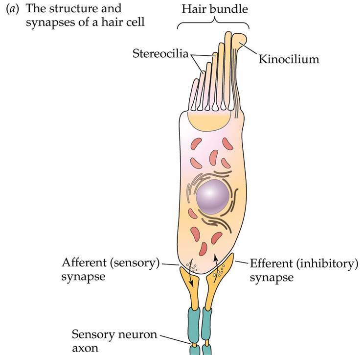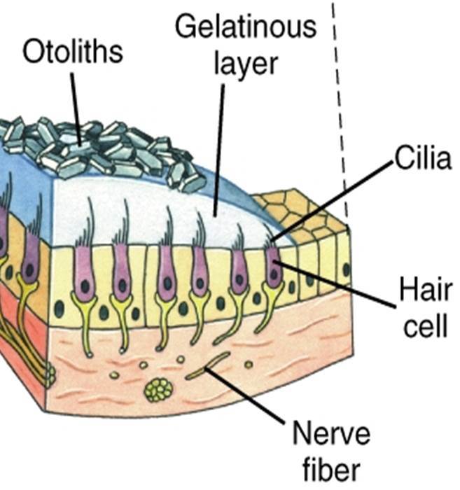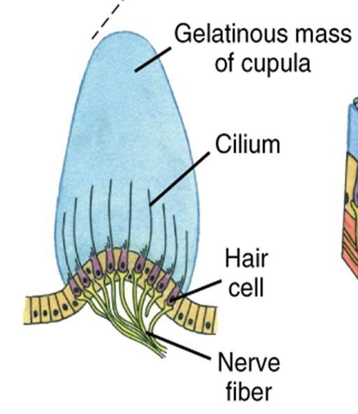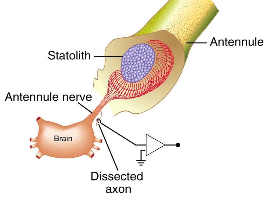 The lobster statocyst contains dense “statoliths” (made of sand or calcified secretions) which rest on hair cells connected directly to axons which go to the brain