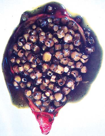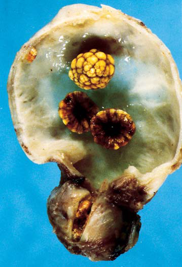 Below are yellow cholesterol gallstones.