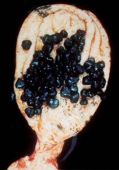 Chronic hemolysis (sickle cell anemia, thallassemia). Cirrhosis. Calcium bilirubinate, bilirubin polymers, calcium salts, mucin.