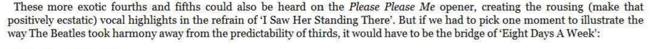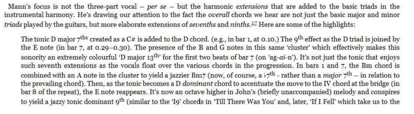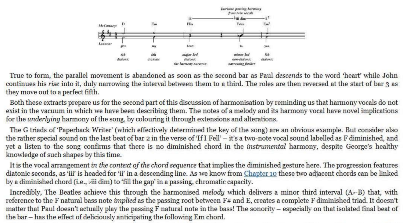 This isn’t the first time that minor third intervals resulting from chromatic excursions in one of the vocal lines have implied non-diatonic chords. The A7 of ‘Baby’s In Black’ is an obvious example, even if it was just a standard, bluesy tonic embellishment on its way to IV. The diminished gesture in ‘ If I Fell’, which occurs purely as a welcome accident of two independent melody lines passing like ‘ships in the night’, marks a degree of sophistication in a pop song that is light years removed from the standard
