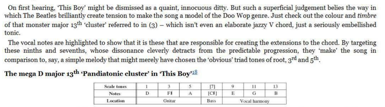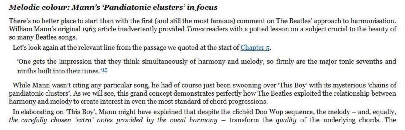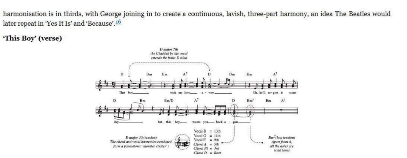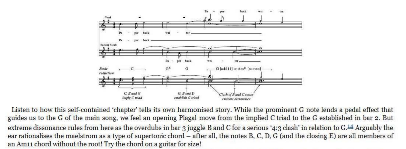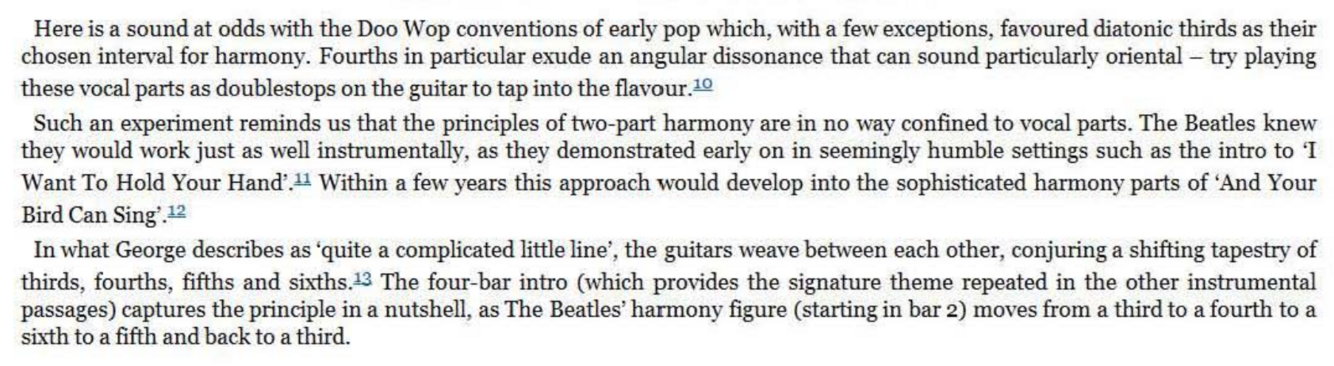The principle of multi- part weaving of harmony reached an awesome peak on ‘Because’, the ultimate case study for further dissection by ambitious readers. But the principle of extreme independence of vocal lines can also be appreciated in Beatles songs from many years earlier. Take the intro to the 1965 single, ‘Paperback Writer’, where an uplifting multilayered vocal, delivered as a