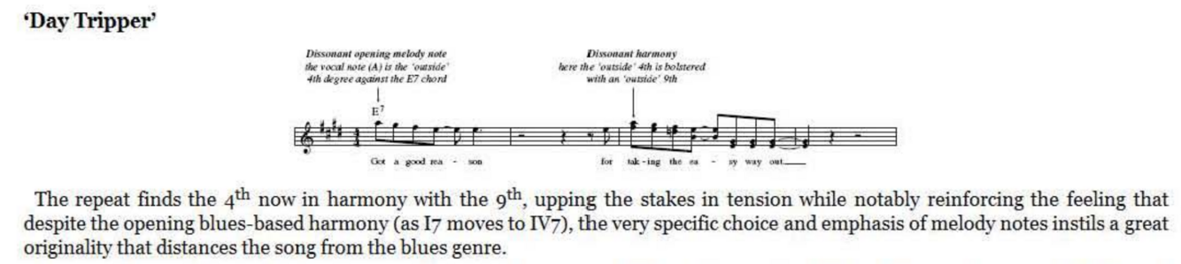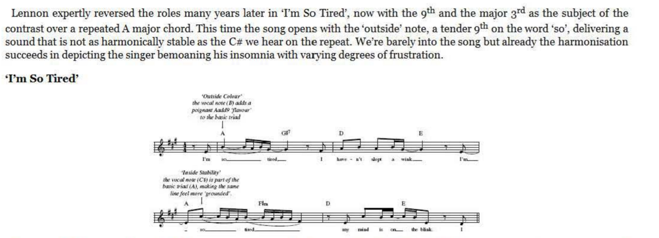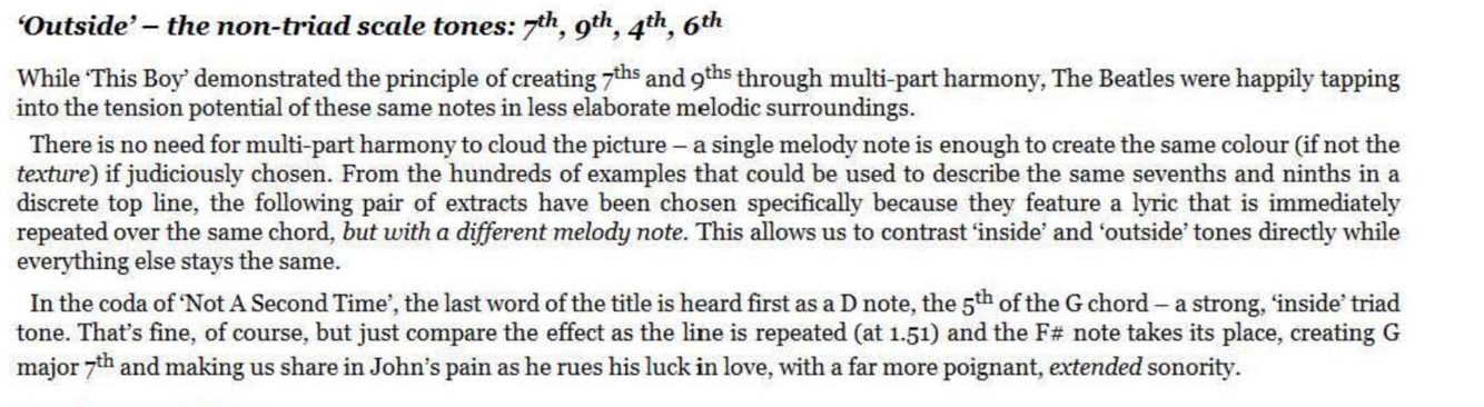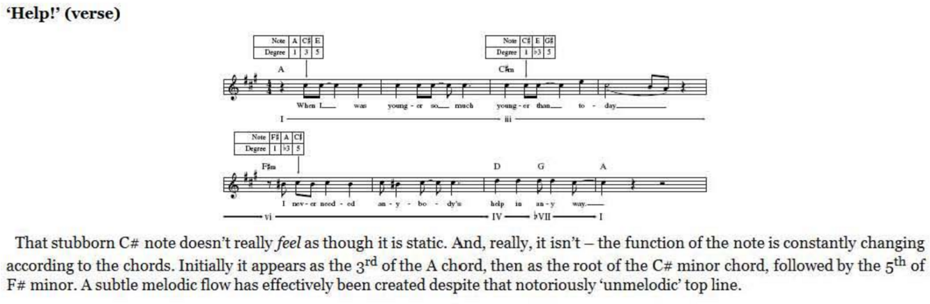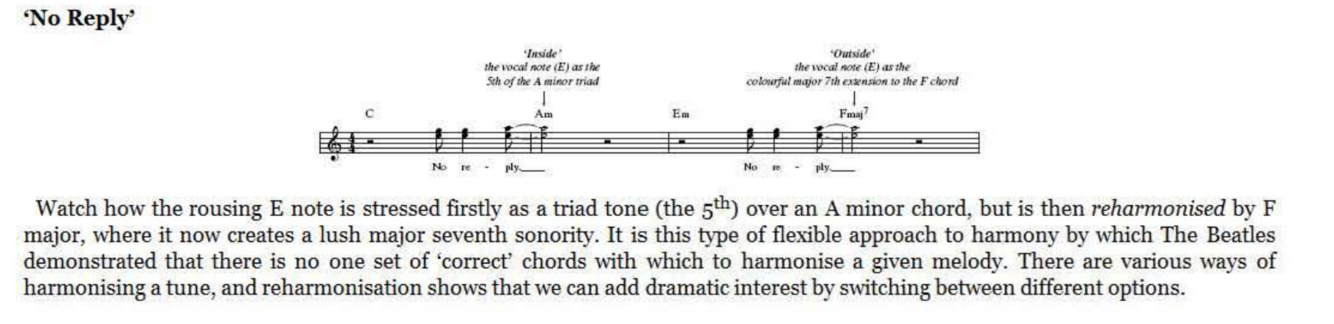 The Beatles’ masterfully judicious approach to ‘outside’ and ‘inside’ notes in their melodies can be seen brilliantly in ‘No Reply’ where the Lennon-McCartney lesson for the day is not merely harmonisation but reharmonisation. This is an important songwriting skill where a given melody previously heard in relation to one particular chord (or sequence of chords) takes on a whole new character when supported by another.
