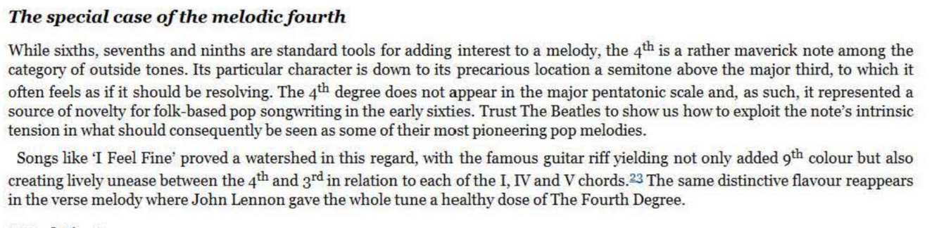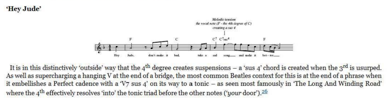 One of The Beatles’ most instantly recognizable 4th degrees is the isolated peak in the verse of ‘Hey Jude’. As we saw in the last chapter, the song starts with a predictable, consonant chord tone. But this is rudely disturbed by the introduction of the 4th degree on the word ‘song’ , prompting us all to rise to the occasion.