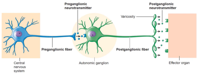 Synapses with the cell body of the postganglionic fiber in a ganglion outside the CNS.