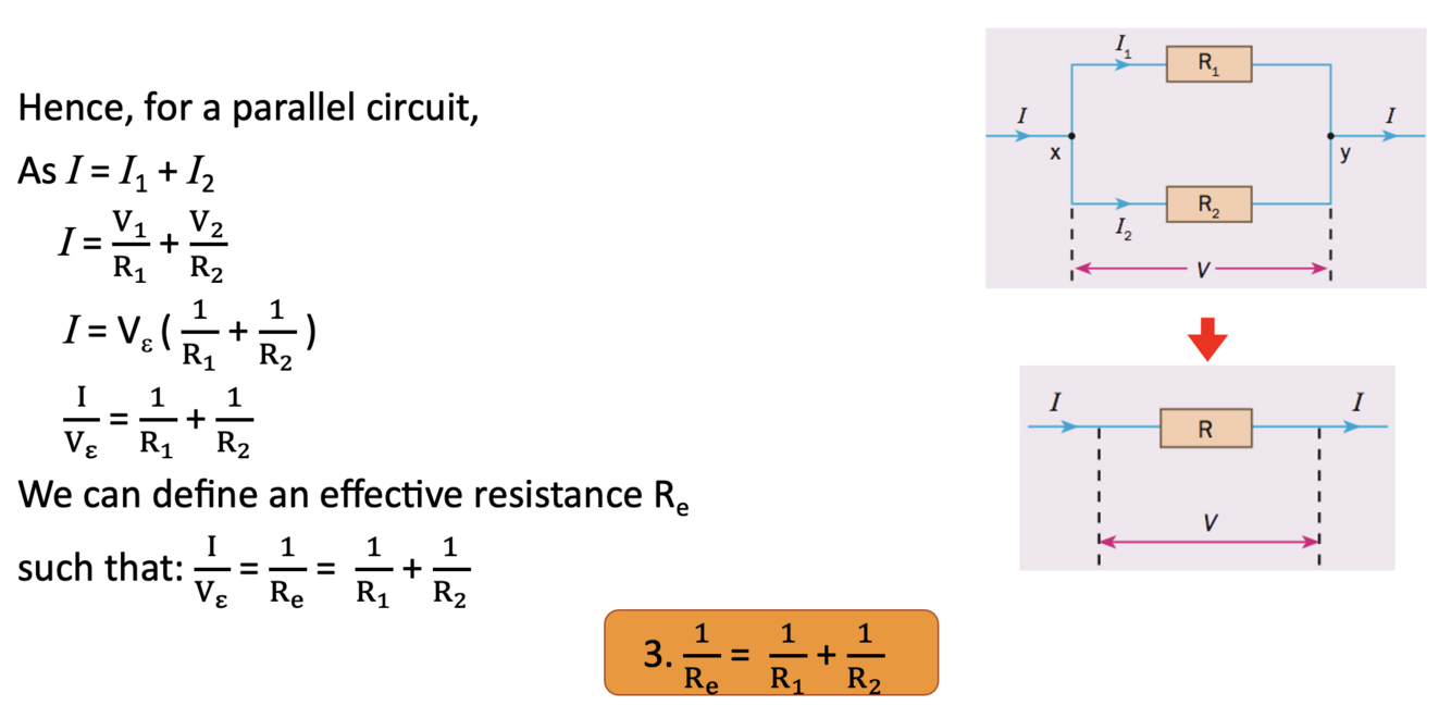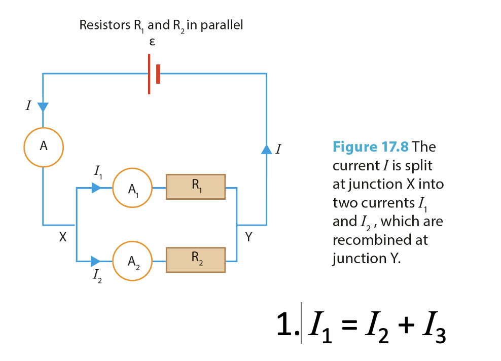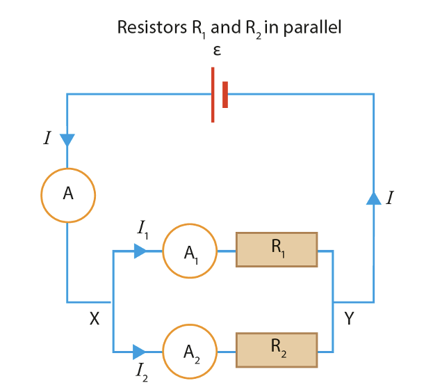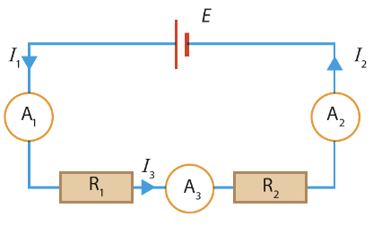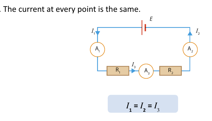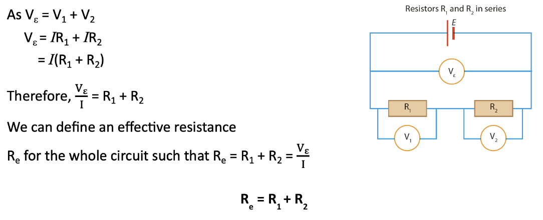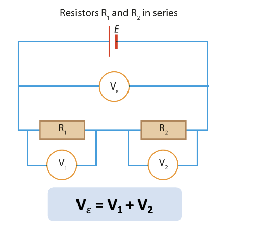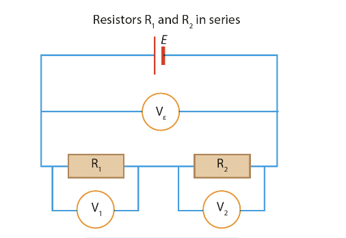 The total potential difference E supplied to the circuit is equal to the sum of individual potential differences across the resistors.