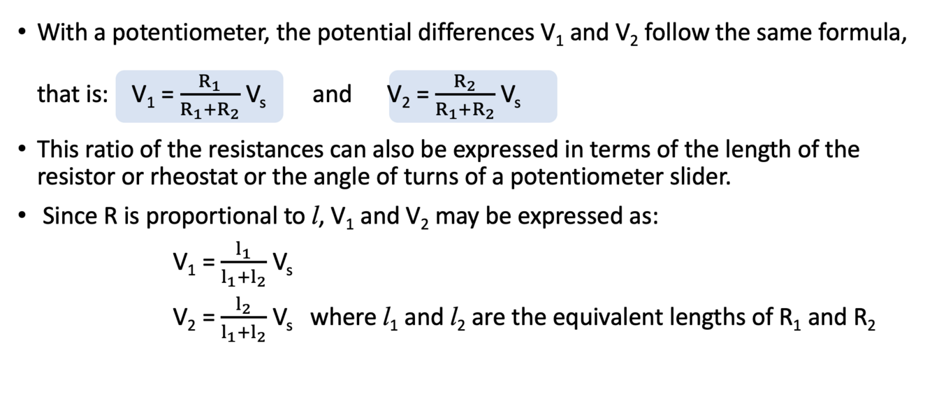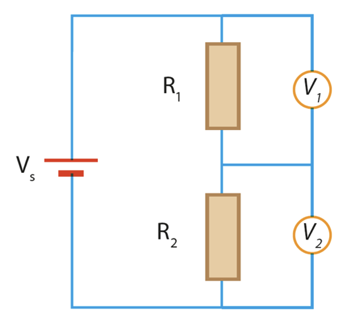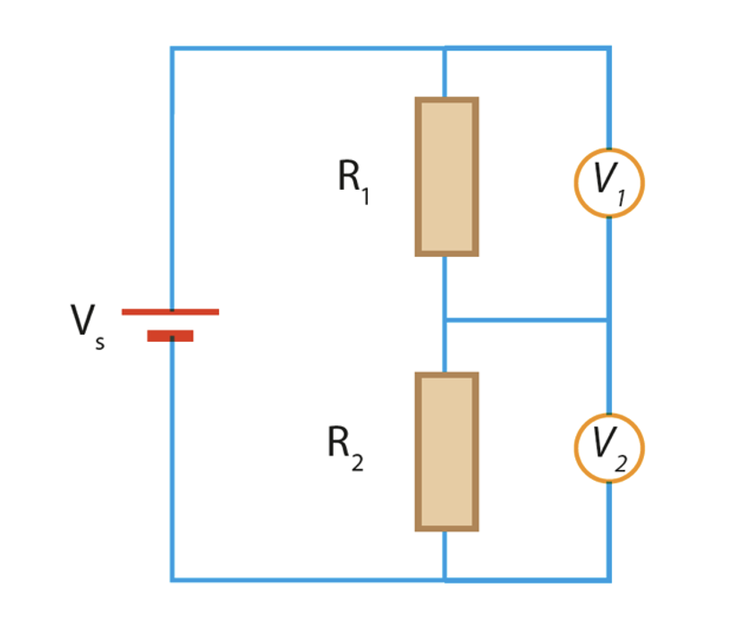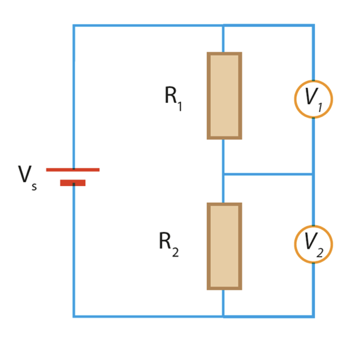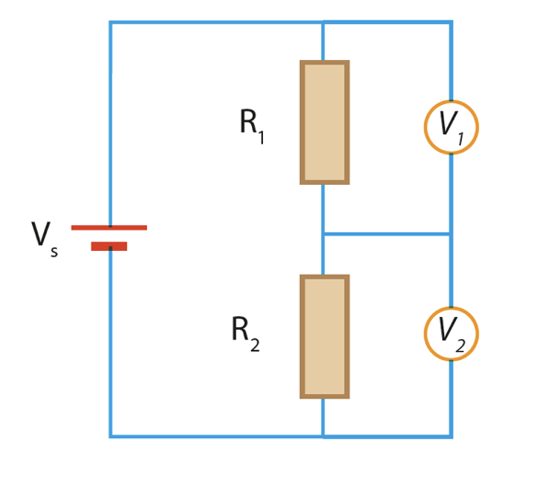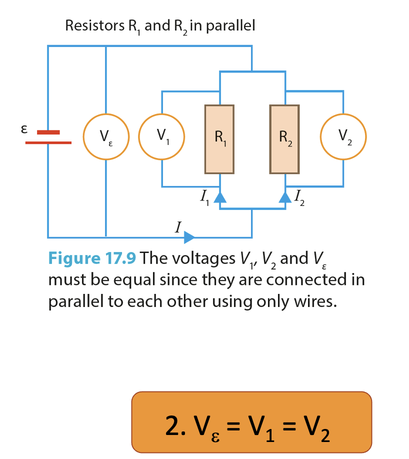 The total potential difference E supplied to the circuit is equal to the sum of individual potential differences across the resistors.